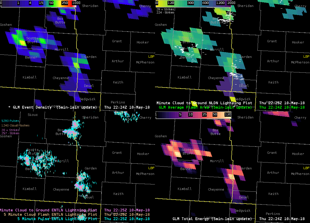“Noticed a marked increase in Flash Density, Total Energy, and Average Flash Area as the storm strengthened over Garden County Nebraska... Included an animation of the GLM data along with ENTLN and NLDN to calibrate my thinking a bit. On the average flash area notice the large flash stretching across Cheyenne and Deuel counties in Nebraska.”  – “Supercell”