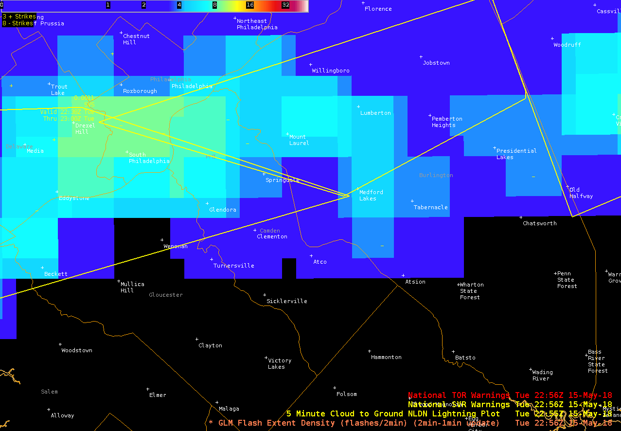“I watched a new cell develop over southern NJ. The main reason this cell stood out was because of a significant increase in Flast [sic] Extent Density. This increase really drew my eye to that part of the line where a cell was rapidly intensifying. This was just another example of the GLM data providing a good overview for situational awareness.” – “wall cloud”